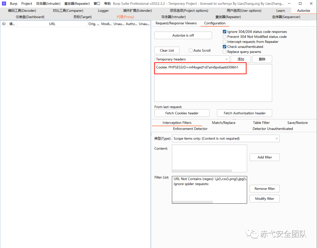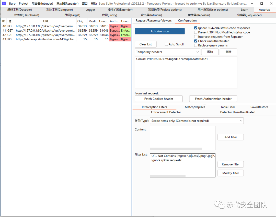 将低权限用户的cookie提供给扩展程序并使用高权限用户浏览网站就足够了,该扩展会自动重复每一个请求与低权限用户的会话并检测授权漏洞;