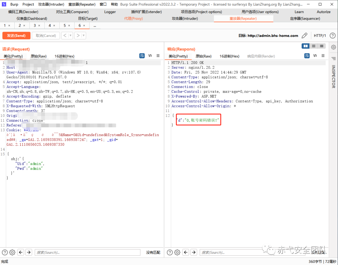我们账号密码输入admin/admin,进行抓包,我们将包首先放到Repeater中看看结构;