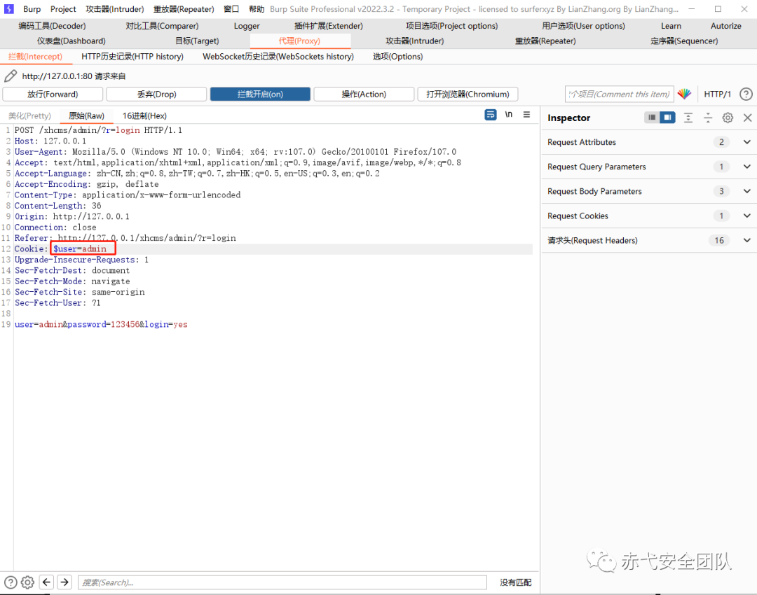 明显可以看出来,Cookie传入了user,如果user为空,退出,就是登陆不成功,我们可以抓包,让他不为空;