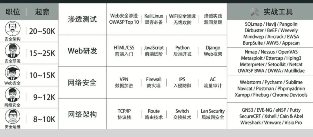 如果你是一个安全行业新人,我推荐你先从网络安全或者Web安全/渗透测试这两个方向先学起,原因如下: