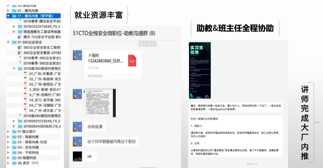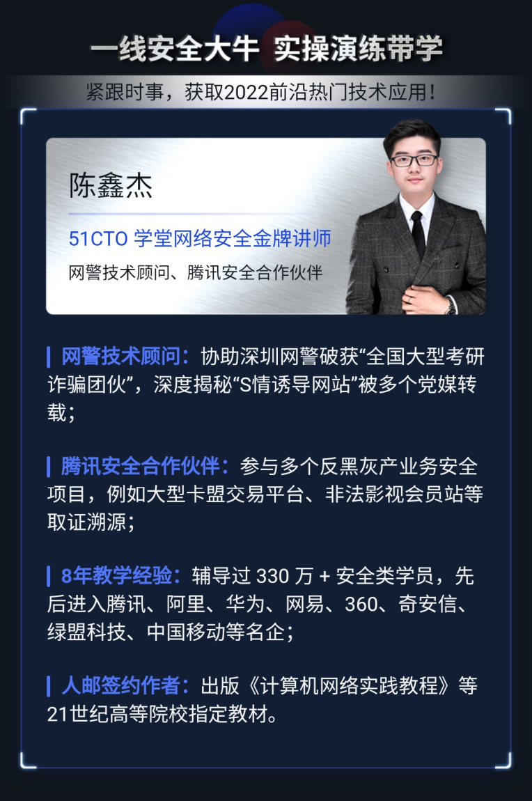 • 有哪些企事业单位在招聘安全人才?如何才能应聘?为普及网络安全行业技术,51CTO联合国内一线网络安全实战大牛陈鑫杰老师,深度结合国内一线互联网、网络安全、政企单位的安全项目需求,经过为期1年的打磨与迭代,共同研发推出了这套深入浅出的网络安全职业实战直播课程《网络安全4天实战特训营》。这门课真正能够帮助你科学体系化地学习网络安全、Web安全、渗透测试、红蓝对抗、漏洞挖掘、CTF黑客攻防赛等前沿安全技能,让你能够更轻松更快捷进入安全行业,改变你的职业轨迹。本安全体验营涵盖网络安全入门指南、安全等保2.0、Kali Linux渗透测试、互联网业务安全实战、情报搜集与反诈骗实战等多个热门前沿安全专题。![]()
