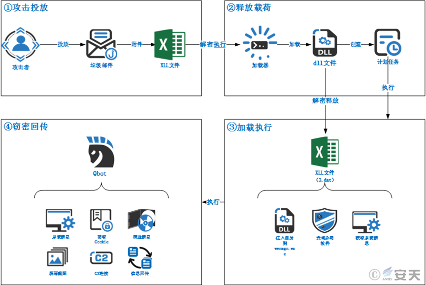 Qbot银行木马于2008年出现,自2020年4月开始进入活跃状态,主要通过垃圾邮件进行传播。2021年2月,研究人员发布《Qbot银行木马2020年活动分析报告》。该银行木马在执行过程中多次解密,利用加载器加载执行恶意功能躲避反病毒软件的静态查杀,利用计划任务实现自启动,能够在受害主机上获取屏幕截图、收集目标系统信息和获取浏览器Cookie信息等。攻击者还能够利用从用户处窃取的数据实施后续的攻击活动。