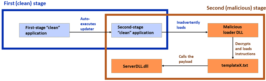 早期的攻击形式已经在业界有所报道,该攻击基于经典的侧载攻击,包括一个干净的应用程序、一个恶意加载程序和一个加密的有效负载,随着时间的推移对这些组件进行了各种修改。最新的活动增加了一个转折点,其中第一阶段的干净应用程序“侧面”加载第二个干净的应用程序并自动执行它,第二个干净的应用程序侧载恶意加载程序 DLL。之后,恶意加载程序 DLL 执行最终的有效负载。