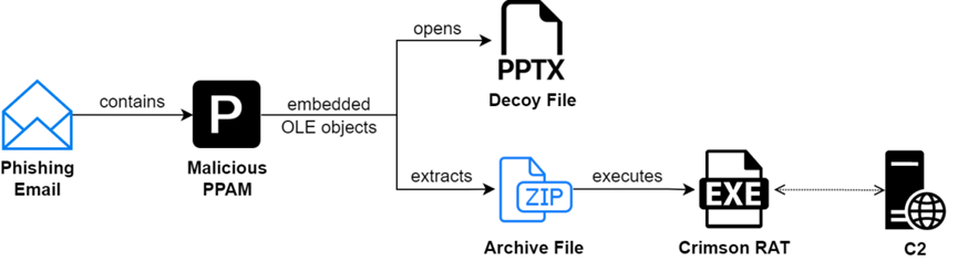以下是此次研究的相关发现:APT36 以“军官发布政策修订最终版”为主题,以恶意 PPAM 文件为目标瞄准印度军队。其使用启用宏的 PowerPoint 附加文件 (PPAM) 用于通过将存档文件嵌入为 OLE 对象来包装恶意负载。感染链导致执行基于 .NET 的 Crimson RAT 负载,该负载可以接收和执行 22 条命令以及持久性机制。APT36 使用的 C2 使用相同的通用名称,通常可以在该威胁组织的 C2 基础设施中找到。从现在针对 IIT 到 NIT 和商学院,研究人员观察到 2023 年第一季度的目标有所增加,并在 2 月达到顶峰。