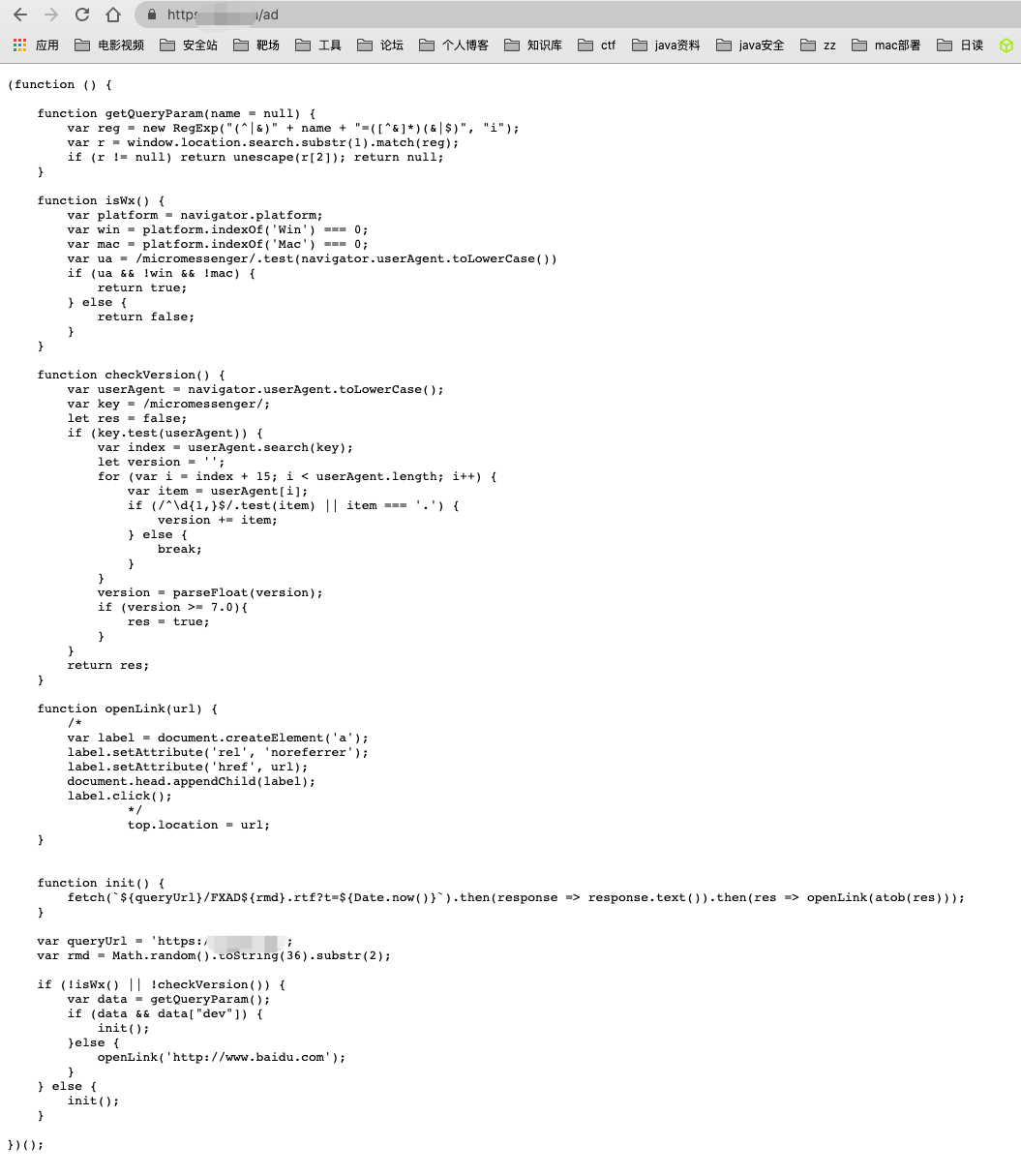 在解码后,你可以看到原js文件请求的URL就是 `//47.100.4.56/`,请求链接会携带当前页面的来源地址(ref)。在代码的最后,会通过 `XMLHttpRequest` 对象进行 GET 请求,并在请求返回后将响应的结果写入一个新页面并打开它,这实现了从远程服务器获取资源并展示到当前页面的功能。