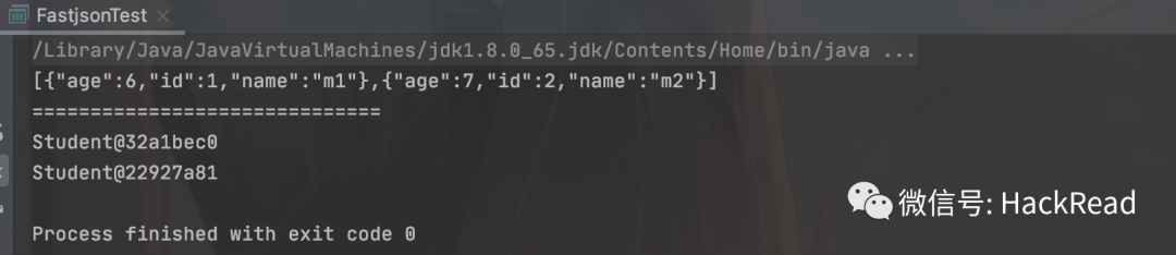import com.alibaba.fastjson.JSON;import java.util.ArrayList;import java.util.List;public class FastjsonTest {public static void main(String[] args) {testListJson();}public static void testListJson(){List<Student> list = new ArrayList<Student>();Student student1 = new Student();student1.setId(1);student1.setName("m1");student1.setAge(6);Student student2 = new Student();student2.setId(2);student2.setName("m2");student2.setAge(7);list.add(student1);list.add(student2);String s = JSON.toJSONString(list);System.out.println(s);System.out.println("==============================");List<Student> students = JSON.parseArray(s, Student.class);for (Student student : students) {System.out.println(student);}}}