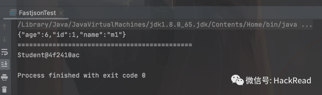 import com.alibaba.fastjson.JSON;public class FastjsonTest {public static void main(String[] args) {display();}public static void display(){Student student = new Student();student.setId(1);student.setName("m1");student.setAge(6);String s = JSON.toJSONString(student);System.out.println(s);System.out.println("=============================================");Student student1 = JSON.parsObject(s, Student.class);System.out.println(student1);}}
