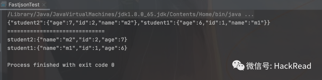 import com.alibaba.fastjson.JSON;import com.alibaba.fastjson.JSONObject;import java.util.ArrayList;import java.util.HashMap;import java.util.List;import java.util.Map;public class FastjsonTest {public static void main(String[] args) {testListJson();}public static void testListJson(){Map<String,Student> map =new HashMap<String,Student>();Student student1 = new Student();student1.setId(1);student1.setName("m1");student1.setAge(6);Student student2 = new Student();student2.setId(2);student2.setName("m2");student2.setAge(7);map.put("student1",student1);map.put("student2",student2);String s = JSON.toJSONString(map);System.out.println(s);System.out.println("==============================");Map<String,Student> jsonObject = (Map) JSON.parseObject(s);for (String key:jsonObject.keySet()){System.out.println(key+":"+jsonObject.get(key));}}}