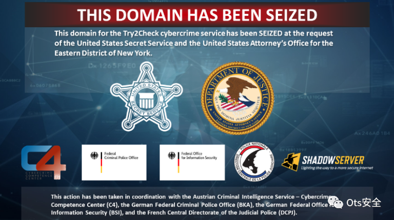 5 月 3 日,星期三,Try2Check 的网站被美国特勤局和美国司法部的域名扣押通知所取代,因为纽约东区的检察官开启了一份起诉书和搜查令,将俄罗斯萨马拉的Denis Gennadievich Kulkov列为东主。