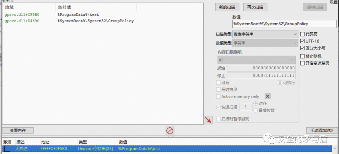 我们接下来使用 CE 来进行这个操作,首先找到进程,然后搜索字符串%SystemRoot%\System32\GroupPolicy,并将其内容修改为%ProgramData%\test。