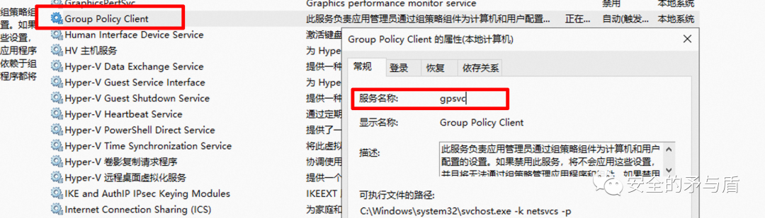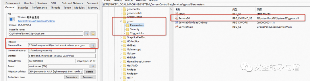 但是到此依然没有找到写注册表的元凶,那我们接下来监控注册表写入事件,看具体哪个服务处理了此RPC请求,经过监控发现对应的进程是 C:\Windows\system32\svchost.exe -k netsvcs -p -s gpsvc,对应的服务是gpsvc;