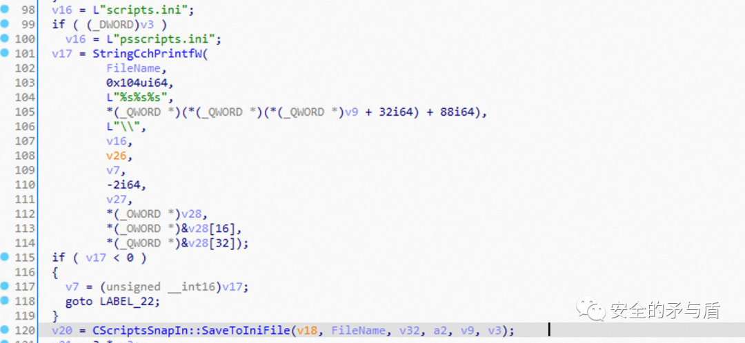 这里可以清楚的看到调用 CScriptsSnapIn::SaveToIniFile 将相关的配置保存在 scripts.ini 文件中。