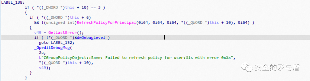 但是此时还没有进行注册表写入操作,我们继续跟踪,发现调用了 gpedit.dll:CGroupPolicyObject::Save函数进行了信息的保存,在其中调用了 GPAPI.dll:RefreshPolicyForPrincipal