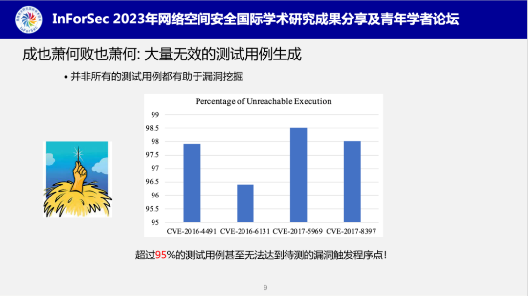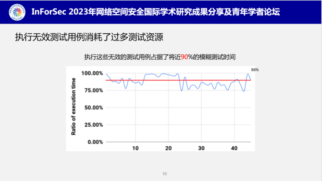 黄博指出,模糊测试的成功核心源于其快速的测试用例生成能力,虽然定向模糊测试已经在学术界取得了巨大进展,但仍然存在不足,即在测试过程中产生了大量无效的测试用例,实验发现,超过95%的测试用例甚至无法达到待测的漏洞触发程序点,而执行这些无效的测试用例占据了将近90%的模糊测试时间。