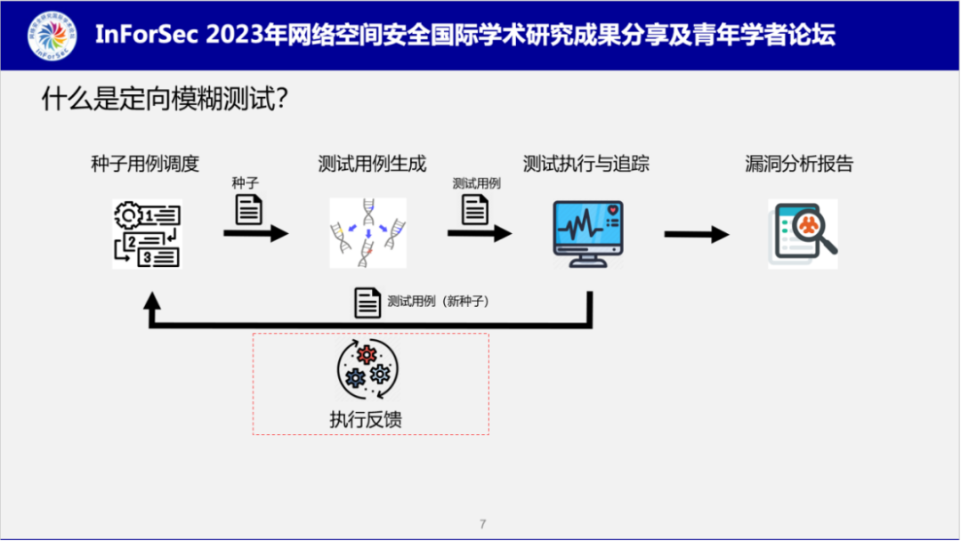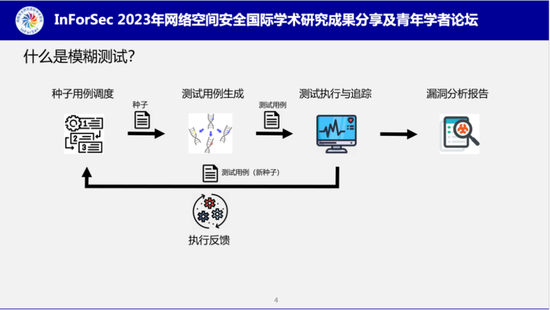 黄河清博士首先介绍了什么是模糊测试技术。模糊测试技术在工业界被证实为最有效的漏洞挖掘技术之一,存在多个知名的企业级云测试平台,如OSS-Fuzz,OneFuzz等。在学术界也超过200篇模糊测试相关的论文被发表在各个计算机领域顶级会议和期刊上。概括的讲,模糊测试主要自动化的生成测试用例并执行以触发程序中的异常错误,当触发异常后可以根据执行过程中的监控信息直接生成漏洞报告提供给开发者,同时,如果测试用例触发了新的程序状态,例如执行到了新的代码块,那么这个输入将会保留被用于进一步的输入生成,这种反馈机制能够很好的帮助模糊测试对目标程序进行更加彻底的探索。