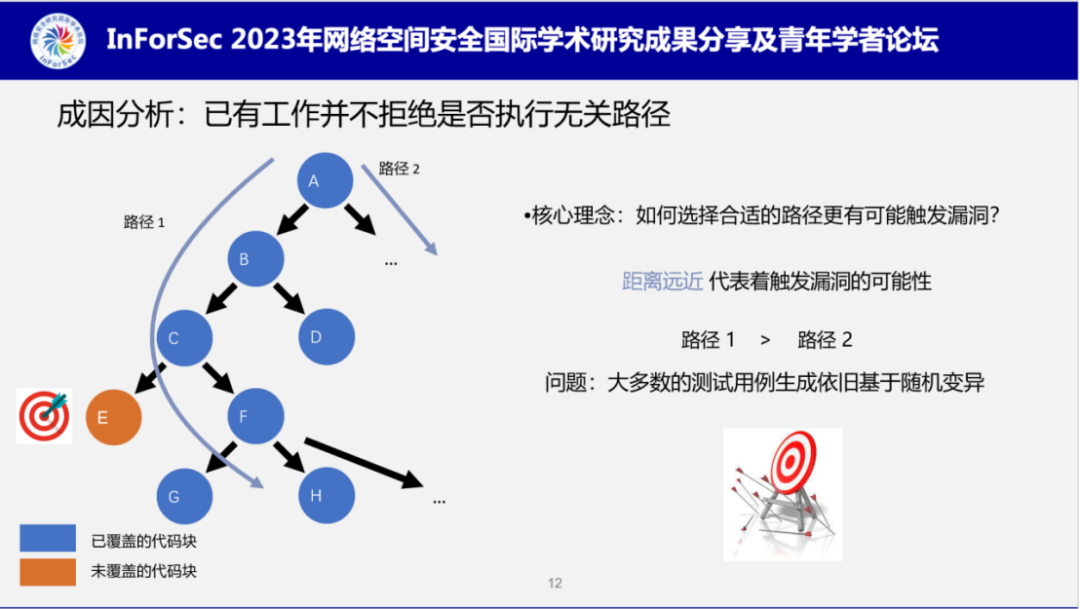 黄博针对这一问题进行了深入的根因分析,他介绍到这种现象所产生的原因在于无关路径爆炸,即现有的模糊测试工具在选择执行路径时并不考虑该路径是否与目标漏洞是无关的。