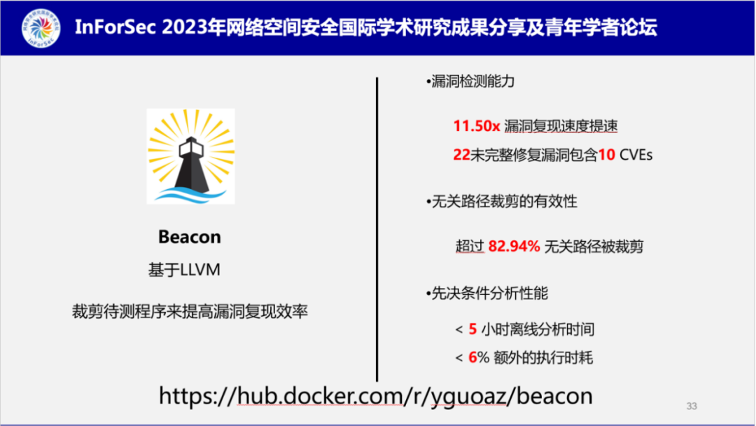 在介绍了解决方案的设计思路后,黄博介绍了他们基于LLVM开发的定向模糊测试工具Beacon的实验效果和性能。其能够实现超过现有最好技术11.5倍的漏洞复现速度,裁剪了超过82.94%的无关路径,发现了22个未完整修复的漏洞,但只引入了不超过6%的开销。