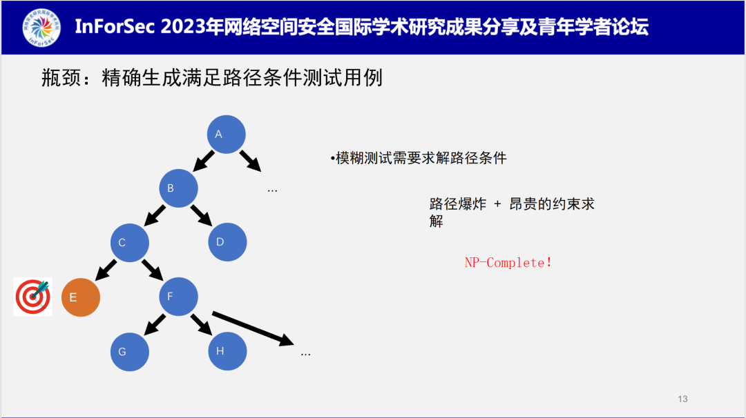 同时,黄博也指出想要精确生成满足路径条件测试用例是很难的,求解路径条件面临路径爆炸和约束求解的难题,是无法使用多项式算法求解的。