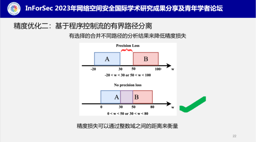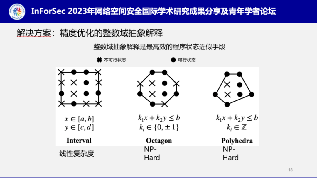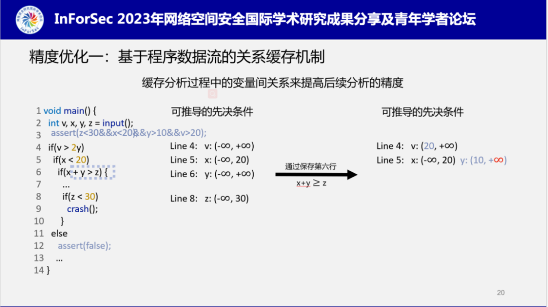 随后,黄博先介绍了他们在数据流角度的精度优化,即数据流的关系保存。整数域抽象只考虑单变量关系,这是造成其不准确的主要原因之一,对此,黄博他们保留了分析过程中的变量间关系以提高后续分析的精度。