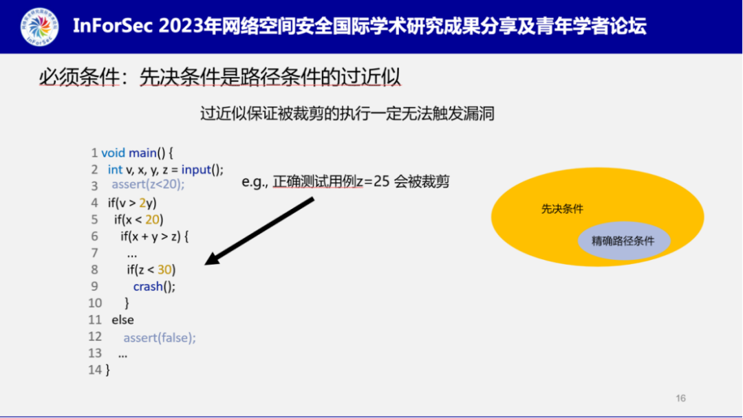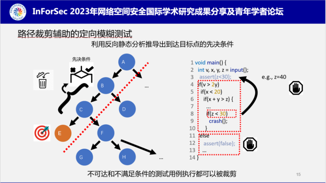 针对这一难题,黄博提出了自己的想法。他认为当程序执行到一条无关路径之后,后续的执行都是无用的,必不可能触发Bug,因此可以被终止执行。基于这样的想法,黄博提出了路径裁剪辅助的定向模糊测试技术,即利用反向静态分析先推导除到达目标点所需的先决条件,所谓先决条件,就是执行到目标指令的必须条件的过近似集合,这样可以保证,基于先决条件裁剪的路径一定是无法触发漏洞的。