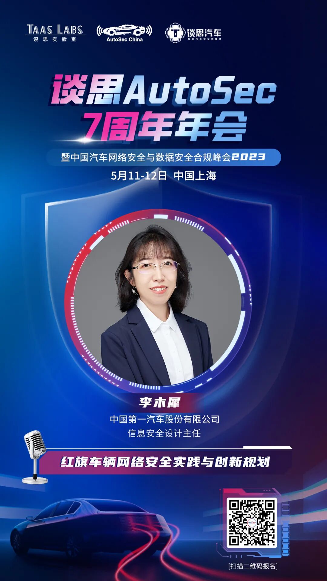 此次,中国第一汽车股份有限公司信息安全设计主任李木犀女士,将在谈思AutoSec 行业7周年年会上分享“ 红旗车辆网络安全实践与创新规划 ”的精彩话题。