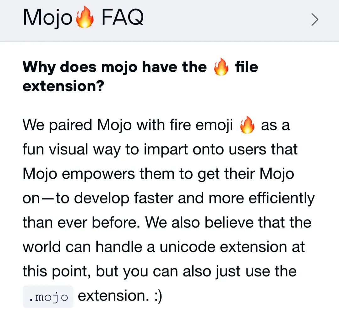出品 | OSC开源社区(ID:oschina2013)Mojo 是 AI 基础设施公司 Modular AI 最近发布的编程语言,它结合了 Python 的语法以及 C 语言的可移植性和性能,目标是使其成为 AI 研究和生产的理想选择。根据介绍,Mojo 不仅兼容 Python,还比它快 35000 倍。为了体现 Mojo 的 “快”,其开发团队埋了一个小彩蛋 —— 支持将 🔥 用作 mojo 的文件扩展名。你没看错,就是一把火。也就是说 hello.🔥是合法的文件,等同于 hello.mojo。他们对此的解释是,通过一种有趣的视觉方式向用户传达:Mojo 让他们能够比以往任何时候都更快、更高效地开发。当然,如果你不喜欢这种略显花哨的扩展名后缀,使用默认的.mojo 扩展名即可。Mojo 的 “骚” 做法引起了另一门流行语言的效仿。Go 开发团队技术 leader Russ Cox (rsc) 今天提出了一项提案:添加新的文件扩展名.ʕ◔ϖ◔ʔ作为.go 的替代方案。https://github.com/golang/go/issues/59968rsc 在提案中写道,Go 在 Unicode 竞赛中已经落后了,因此决不能让这种情况持续下去。他建议大家将谨慎抛诸脑后,将 .ʕ◔ϖ◔ʔ 作为 .go 的替代拼写,如 hello.ʕ◔ϖ◔ʔ。话说回来,ʕ◔ϖ◔ʔ 确实和 Go 的吉祥物有几分神似,你觉得呢?![]()
