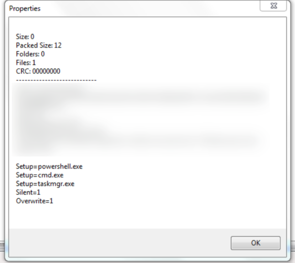 如上图所示,注释显示攻击者自定义了SFX档案,以便在提取过程中不显示对话框和窗口。攻击者还添加了运行PowerShell、命令提示符和任务管理器的指令。