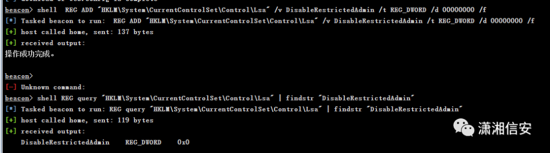 //开启Restricted Admin modeREG ADD "HKLM\System\CurrentControlSet\Control\Lsa" /v DisableRestrictedAdmin /t REG_DWORD /d 00000000 /f//查看是否已开启0x0则表示开启REG query "HKLM\System\CurrentControlSet\Control\Lsa" | findstr "DisableRestrictedAdmin"