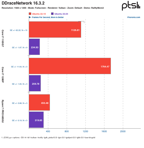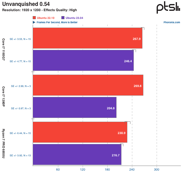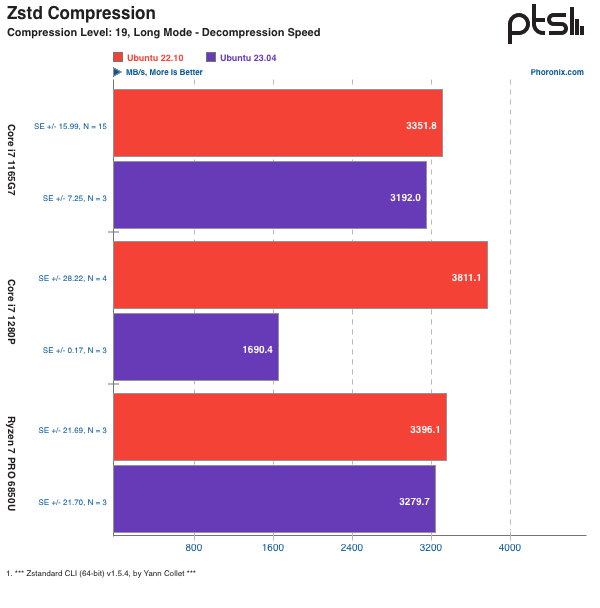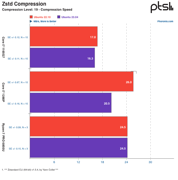 首先进行的是 DDraceNetwork 测试,这是一个开源的合作平台游戏。游戏会使用 Vulkan 或 OpenGL 3.3 进行渲染(测试结果为游戏帧率,分数越高越好)。Ubuntu 23.04 在测试使用的三台笔记本电脑上的表现均比 Ubuntu 22.10 要差,尤其是在 Vulkan 测试中,性能更是大幅下降(下图)。而且,无论是英特尔还是 AMD 集成显卡,性能都不可避免地出现下滑。接下来是 Unvanquished 测试(分数越高越好),这是 Tremulous 第一人称射击游戏的一个现代分支。Unvanquished 由 Daemon 引擎驱动,它是 ioquake3(id Tech 3)引擎与 XreaL 引擎的结合。Unvanquished 支持现代 OpenGL 3 渲染器和其他先进的图形功能。同样,在这三台笔记本电脑上都观察到了游戏 / 图形性能的大幅下降。至于下降的原因,鉴于它同时发生在英特尔和 AMD 的显卡上,测试人员认为可能是 GNOME 44 所导致的退步,但此次测试比较匆忙,还需要仔细研究才能断定。压缩测试: