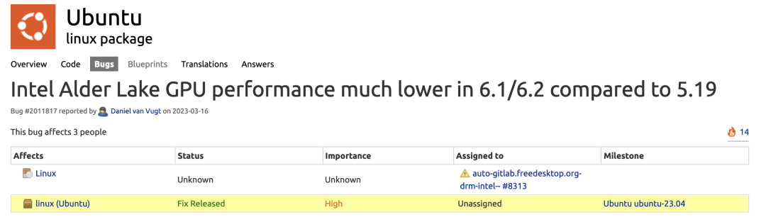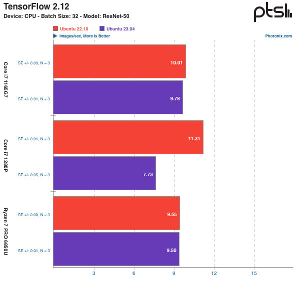 SVT-AV1 开源视频编码器 / 解码器的基准测试最初是由英特尔开发的,此后,SVT-AV1 的开发转移到了开放媒体联盟,作为 AV1 上游开发的一部分。SVT-AV1 是一个基于 CPU 的多线程视频编码器,适用于 AV1 视频格式(分数越高越好)。Ubuntu 23.04 的性能相比 Ubuntu 22.10 依然有小幅差距。在这个环节的测试中,英特尔酷睿 i7 1280P 笔记本电脑在 Ubuntu 23.04 下的表现则是比 22.10 差了一大截。不光是上面这两个测试,在接下来的 OpenSSL(分数越高越好)、TensorFlow(分数越高越好)、SQLite(分数越低越好) 等测试中,采用 Alder Lake 处理器的笔记本电脑,不光性能下降幅度最大,甚至在很多测试中,性能表现比上一代的 Tiger Lake 还要低。当对在 Ubuntu 22.10 和 23.04 之间的三台不同的笔记本电脑上进行的 67 项测试结果进行几何平均后,英特尔 Tiger Lake 和 AMD Rembrandt 笔记本电脑表现出类似的性能,反而较新的英特尔 Alder Lake 笔记本电脑在 Ubuntu 23.04 上有了明显的性能下降。至于 Alder Lake 在 Ubuntu 23.04 性能大幅下滑的原因,测试人员现在也还不清楚。不过,通过 Ubuntu 错误跟踪器,自 3 月中旬以来一直有一个错误报告,该报告显示英特尔 Alder Lake GPU 在 6.1~6.2 内核下比以前的 5.19 内核有了性能的明显退步,并且该问题的重要程度被标记为 "高"。完整测试报告可查看:https://www.phoronix.com/review/ubuntu-2304-laptops---END---
