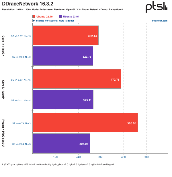 从 Ubuntu 22.10 升级到 Ubuntu 23.04 意味着内核从 Linux 5.19 升级到了 Linux 6.2、GNOME 从 43 升级到 GNOME 44,Mesa 从 22.2 到 23.0.,Python 从 3.10 到 3.11(具体升级内容可查看:Ubuntu 23.04 正式发布)。GCC 12.2 仍然是 Ubuntu 23.04 的默认系统编译器,GCC 13 要到 Ubuntu 23.10 发布时才会内置在 Ubuntu 系统中。但上述这些变化,在此次基准测试中都没有带来显著的性能提升。先说结论,至少在目前,如果你希望 Ubuntu 23.04 能够在 Ubuntu 22.10 的基础之上带来显著提升性能的话,那么可以暂时打消这个念头,经过多轮测试,Ubuntu 23.04 在一系列的工作负载中,普遍都比 Ubuntu 22.10 的成绩要差那么一些,甚至在某些测试方面还远远落后于 Ubuntu 22.10,英特尔和 AMD 的硬件测试结构均是如此。图形测试: