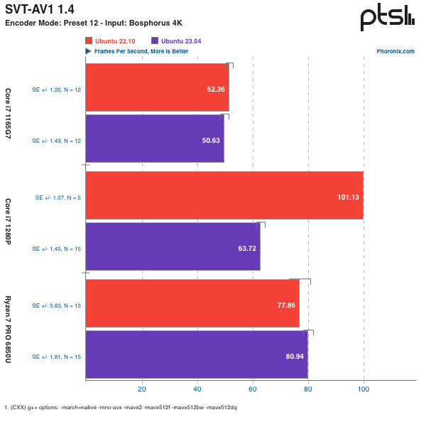 Zstd 压缩测试是测量了使用 Zstd 压缩技术压缩 / 解压一个样本文件所需的时间(结果是速度快慢,分数越高越好)。这个环节,主要是涉及 CPU 负载,英特尔和 AMD 笔记本电脑在工作负载中的表现与 Ubuntu 22.10 差不太多,略低一点。但是在 Core i7 1280P Alder Lake 笔记本上,则是有明显的性能下降。编解码测试