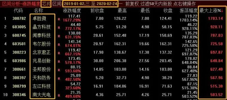 下图是这轮国产替代行情中芯片板块指数的走势图以及这个区间板块内个股的涨幅统计,以图片最右边的最大涨幅排序。