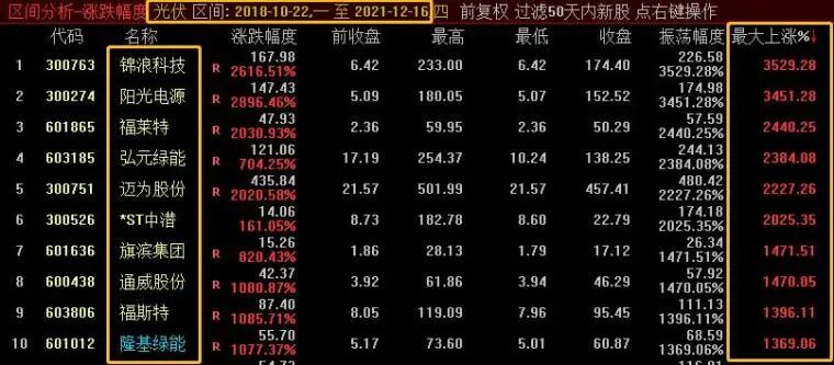 这期间,光伏的领涨股涨幅更是巨大,15倍已经成了涨幅前十的入门槛,6支标的涨幅超过20倍,最高涨幅超36倍。