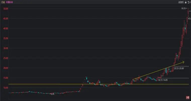 见上图,万兴科技、中国科传本身就走在主升浪中,但是当他们突破了短期上涨压力趋势线后,上涨的角度就会加快,更暴力的阶段就要来临。至于突破的成功率的问题,用趋势线和传统技术解决不了。用《术论》理论体系中的内容可以解决这个问题。