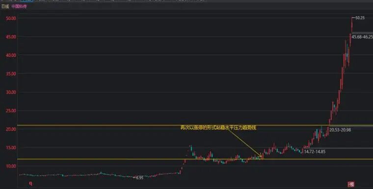 见上图,股价在水平压力趋势线附近震荡,直到2023.02.10日,再次以涨停的方式突破水平压力趋势线。