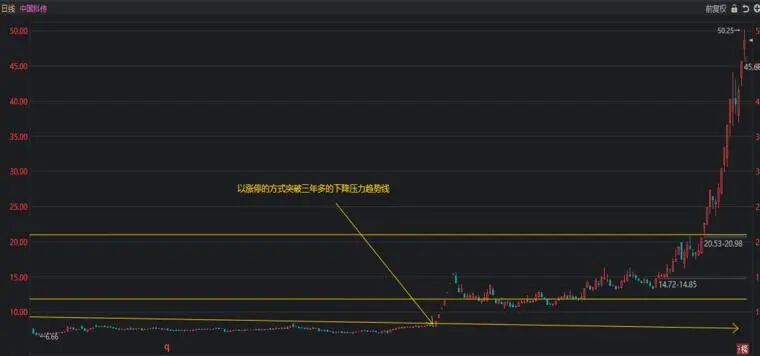 见上图,2022.11.22日,中国科传以涨停的方式突破了压制股价三年多的下降压力趋势线,后边连续涨停确认突破有效。