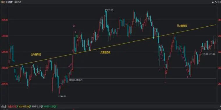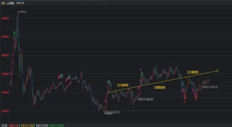 见上图,一条趋势线由压力变为支撑再变为压力。根据这条趋势线,上证指数去年从2863点反弹到3424点受阻就不奇怪了。这条趋势线依然有很强的意义。后边不管上证指数是回调后再涨,还是直接涨,3550点附近都是一个强压力区。