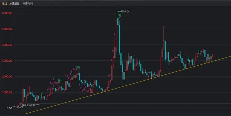 见上图,为上证指数季线图,这条支撑趋势线是上证指数的最强支撑,因此,如果你看到有人在去年2863点、2885点看上证指数要反转的,并没有多么神奇,学会趋势线,你也可以。