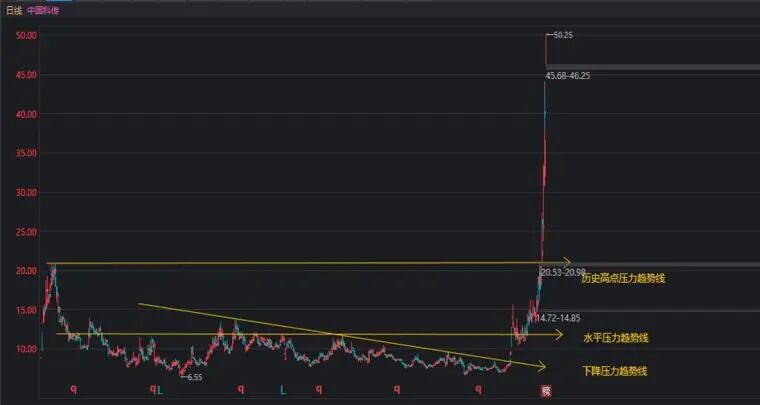 见上图,中国科传上市以来最重要的三条趋势线,2019年6月和2020年10月形成的下降压力趋势线,一直压制股价的上涨,只有突破这条趋势线,股价才有机会大涨。