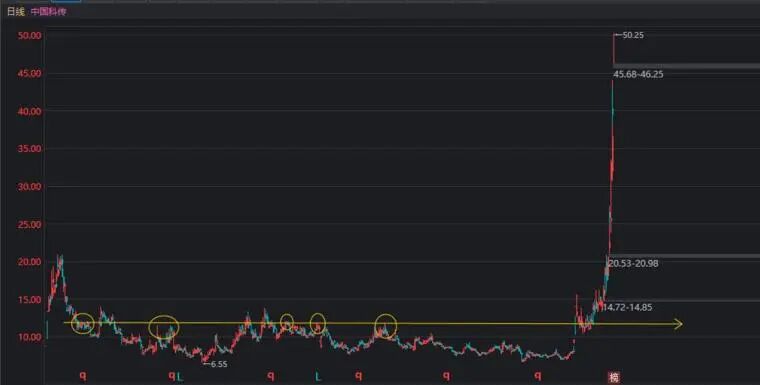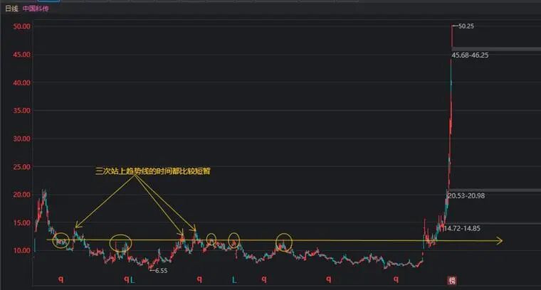 见上图、中国科传上市以来日K线图,这条水平趋势线并没有选取最高点,但是有5次圆圈处在这里受阻