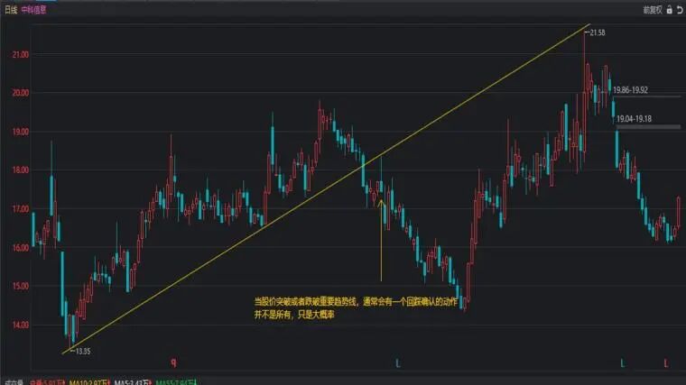 看上图,当股价突破或者跌破重要趋势线时,大多数会有一个回抽确认的动作,如果回抽还不能站稳趋势线,证明趋势线被有效突破或者跌破。