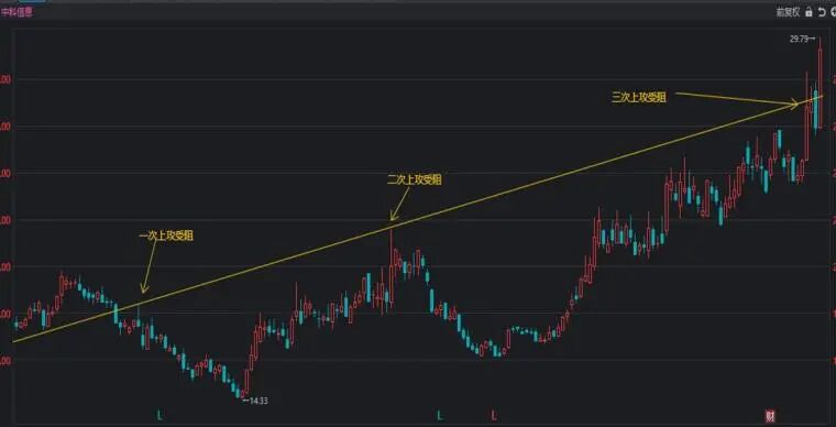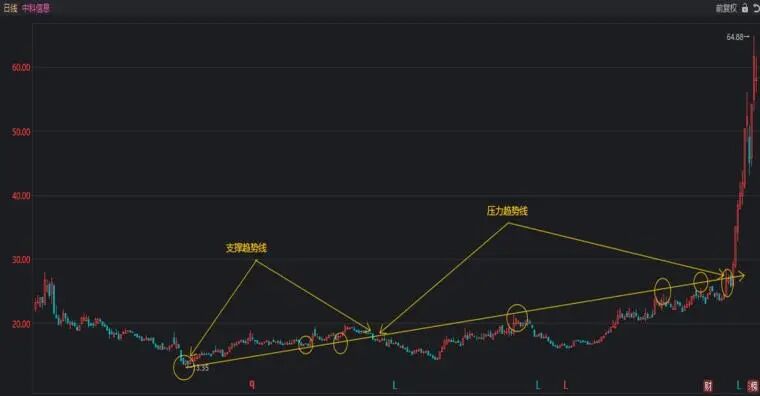 见上图,中科信息在跌破这条支撑趋势线后,这条支撑趋势线变为压力趋势线,在随后的的几个月中几次股价达到这个位置就会回落。指导后边长阳突破,才开启主升浪。