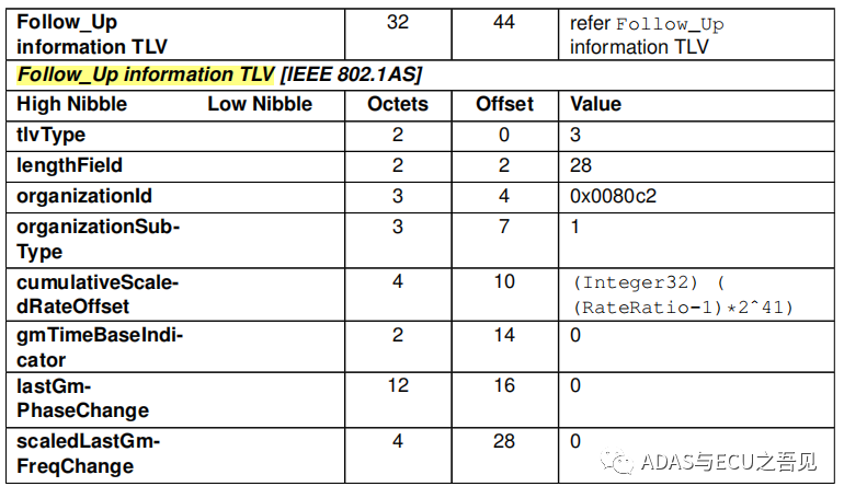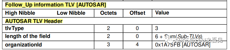 AUTOSAR规范下的Follow_Up Message 与IEEE802.1AS规范下Follow_Up Message相比,在Length of Message长度方面多增加了一些字节,其余没有区别,原因是由于AUTOSAR规范下的Follow_Up Message增加了诸多TLV字段 。