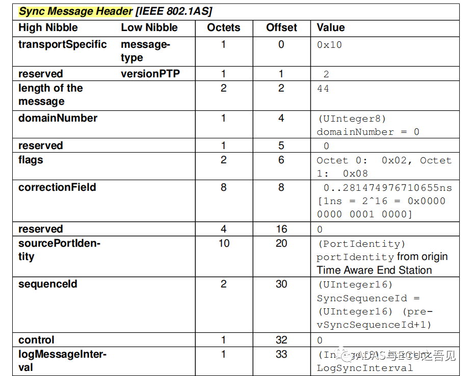 以IEEE802.1AS规范下的SYNC报文头信息格式为例,如下图所示: