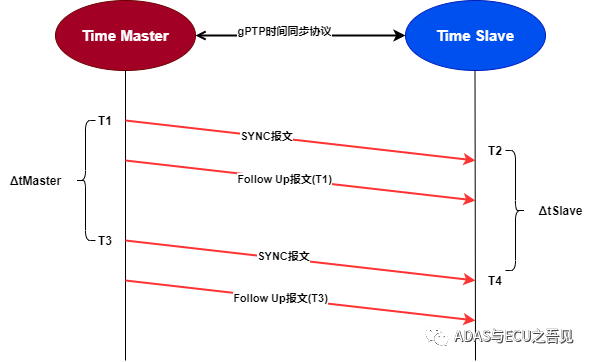 图5 gPTP时间同步原理 如上图5所示,基于gPTP的时间同步协议通过SYNC报文与FollowUp报文来实现同步,同步流程如下: